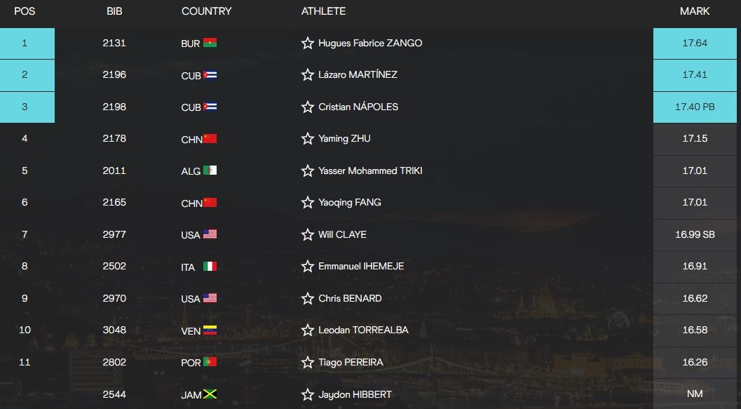 男子三级跳远决赛中国选手朱亚明以17米15的成绩位列第四名,方耀庆17米01位居第六名。布基纳法索选手赞戈以17米64的成绩夺得冠军,每一跳都保持很好的提升,尤其第五跳完成突破帮助他拿下金牌。古巴选手马丁内斯和纳波勒斯包揽银牌和铜牌。