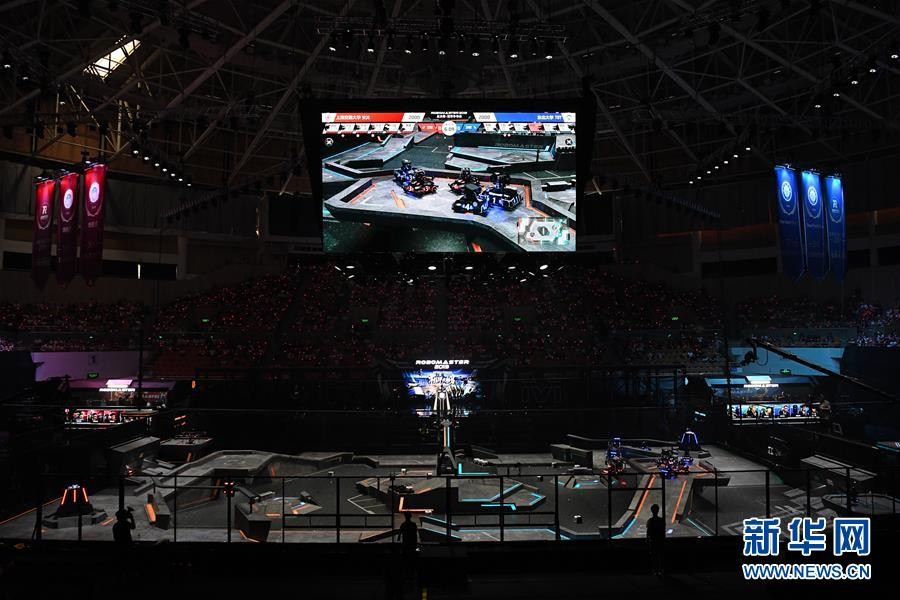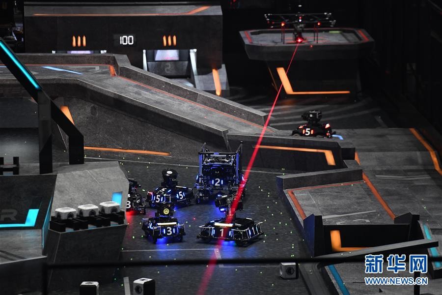 8月11日,东北大学TDT战队和上海交通大学交龙战队在比赛中。 新华社记者 梁旭 摄