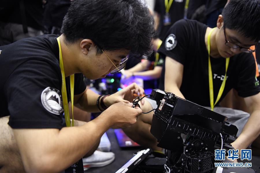 8月11日,东北大学TDT战队队员在赛前调试机器人。 新华社记者 梁旭 摄