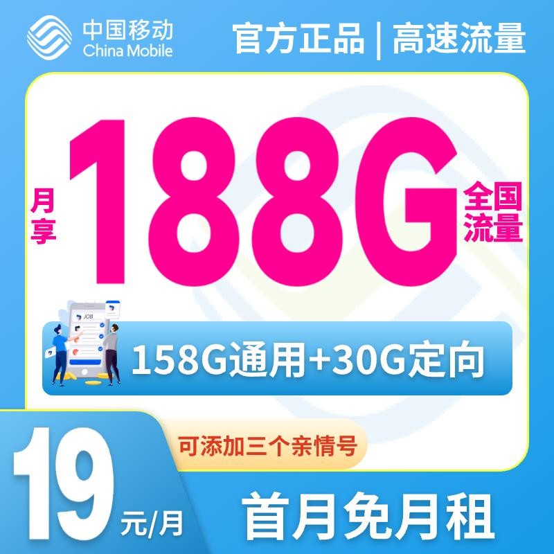 移动春花卡 19元每月188G|158G通用+30G定向 ,赠送三个亲情号,首月还免月租