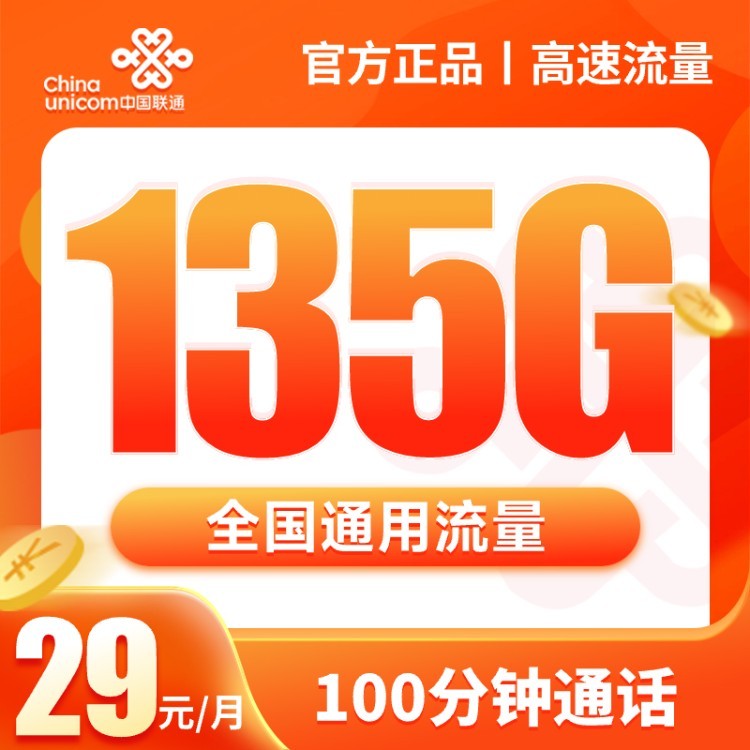 联通桂花卡 29元每月135G全国通用流量 ,一百分钟全国通话,首月还免月租