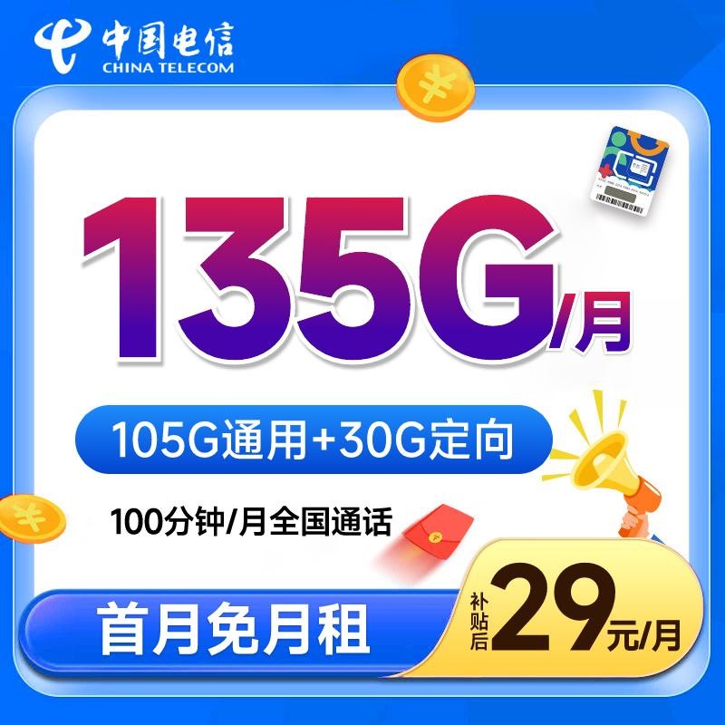 电信柠檬卡 29元每月135G|105G通用+30G定向 ,一百分钟全国通话,首月还免月租