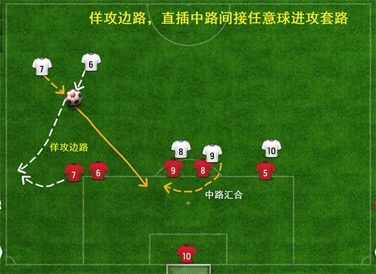 起初7号与6号两个人站在球前,其中6号球员负责纵向跑动吸引对手,另外一名球员9号从中央插入制造出的空当,而开球者7号向空当位置传球,9号球员接球后突破单刀射门。