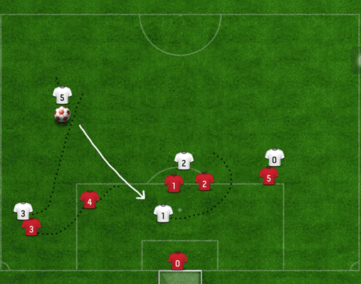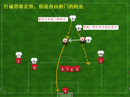 红方为防守一方,白方为进攻一方。离球有一段距离的球员6号直接进行纵向跑动,并做出想要得球的样子(必须非常逼真),从而最大程度的吸引对手的防守注意力,而在球附近的那名球员9号,只需做出一个横传,为此前一直装作若无其事的后方球员5号架炮。