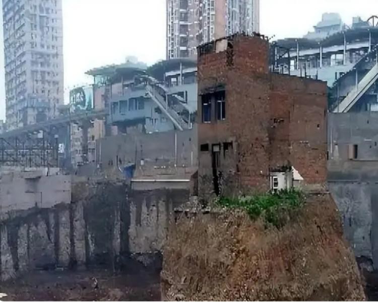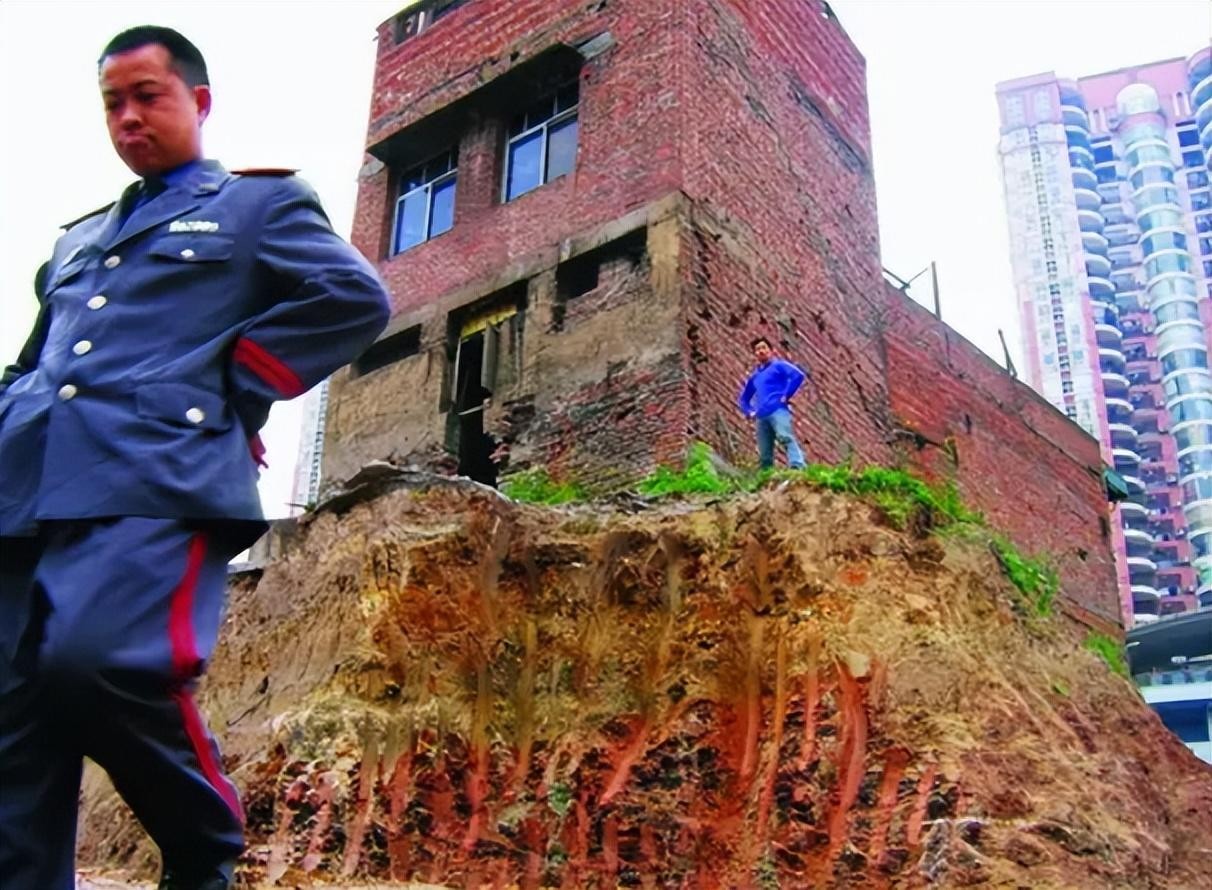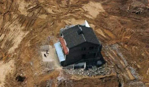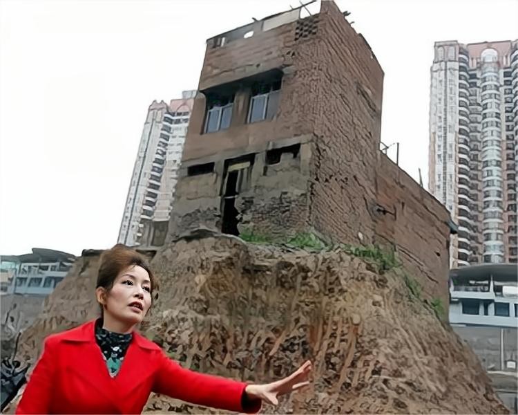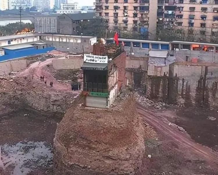 2007年,一张照片在网络上迅速传播开来,照片中,一栋独立的小楼孤零零地立在深坑之上,楼顶挂着五星红旗,一个中年妇女手持扩音器,表情激动。