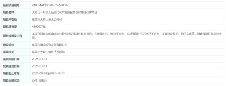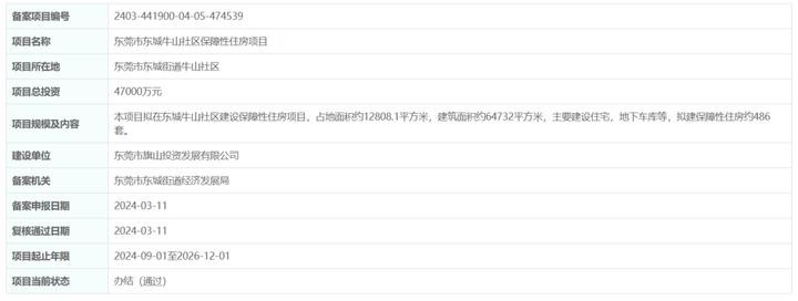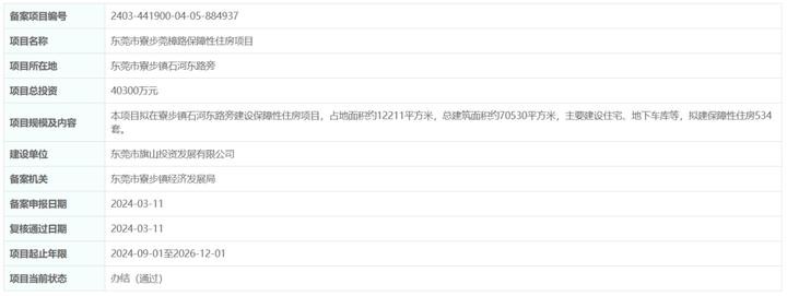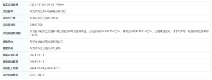据广东省投资项目在线审批监管平台显示,3月11日,东莞首批保障性住房项目完成投资备案。