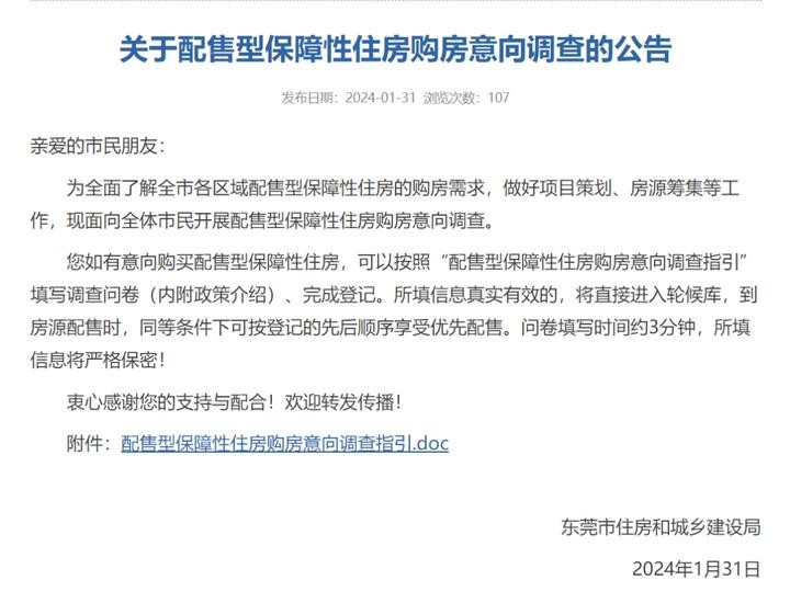 今年1月31日,东莞市住建局发布了《关于配售型保障性住房购房意向调查的公告》,明确了首批保障性住房项目的户型、价格以及申购条件等。