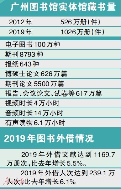 据广图馆长方家忠介绍,截至去年底,广州图书馆新馆接待访问798.4万人次,平均每天有2.5万人次到馆,继续保持国内公共图书馆领先位置。同时,广州图书馆的实体馆藏资源总量累计达到1026万册(件),馆藏总量突破千万,标志着广州图书馆已排在大型公共图书馆前列。