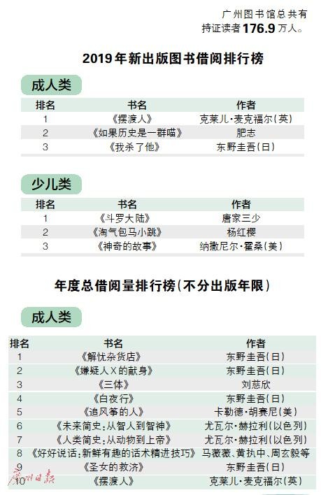 不过,在不分出版年限的总借阅量榜单上,《摆渡人》只排在成人类的第十位,前三位分别是东野圭吾的《解忧杂货店》《嫌疑人X的献身》,及刘慈欣的《三体》,四到十位分别是《白夜行》《追风筝的人》《未来简史:从智人到智神》《人类简史:从动物到上帝》《好好说话:新鲜有趣的话术精进技巧》《圣女的救济》《摆渡人》。少儿类的前十位则被孙家裕编创的“寻宝记”系列“霸榜”,首位是《广东寻宝记》,后面是甘肃、四川、陕西、云南、安徽、河南和江西的“寻宝记”,只有杨红樱的《笑猫日记·樱花巷的秘密》和英国作家J·K·罗琳的《哈利·波特与魔法石》挤进前十,分列第五和第七位。