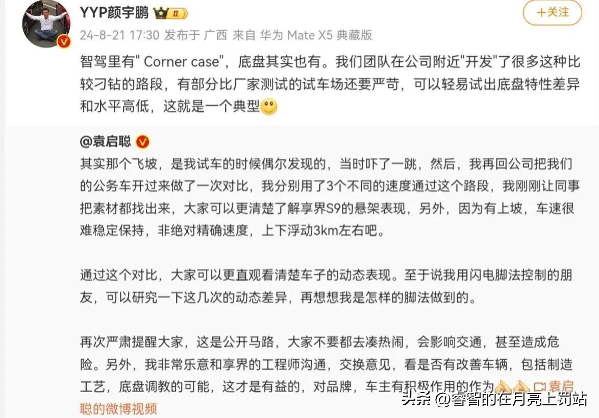 先说说袁启聪的事吧。他对一款叫享界 S9 的车做了评测,本来一切都挺正常的,直到有人发现他在测试中动了方向盘。这一下可炸锅了,有人质疑他是不是有意在影响测试结果,评测的公正性立刻成了焦点。有意思的是,这件事背后还牵扯到其他车评人。颜宇鹏站出来为袁启聪说话,声称有人故意给袁启聪扣帽子,甚至说他因为帮长荣集团说话,惹了不少网友生气,现在有人故意抓住这件事不放,好给他找黑料。这个时候,另一个车评人孙少军也没闲着,他站出来回应,表示袁启聪的事情完全是网友自己发现的,跟他没关系,但他也顺带提了一下自己和颜宇鹏之间的过节,还指责汽车评测行业的公正性问题。