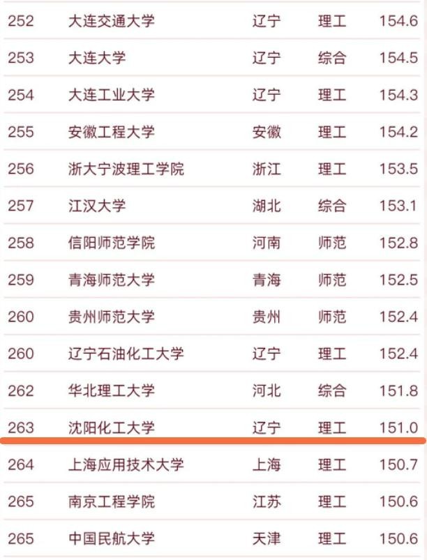 我们来看一下沈阳化工大学在软科排行榜的名次。2022年,沈阳化工大学的排名为263名,这一区间的高校,主要有大连交通大学、大连工业大学、安徽工程大学、华北理工大学、南京工程学院、中国民航大学等。因此,如果是将报考目标设定在这一范围高校的考生,是有机会报考沈阳化工大学的。