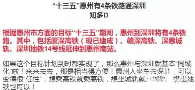 目前已经建成的莞惠城轨,也是惠州到广州、佛山的主要通道,也可以换乘到深圳。这也就是说,惠州将融入珠三角半小时生活圈。 “围绕珠三角城际轨道交通网建设,惠州即将启动深惠城轨项目,从深圳前海经仲恺到惠城。”胡建斌说,目前正在做前期工作,确保在“十三五”开工建设。