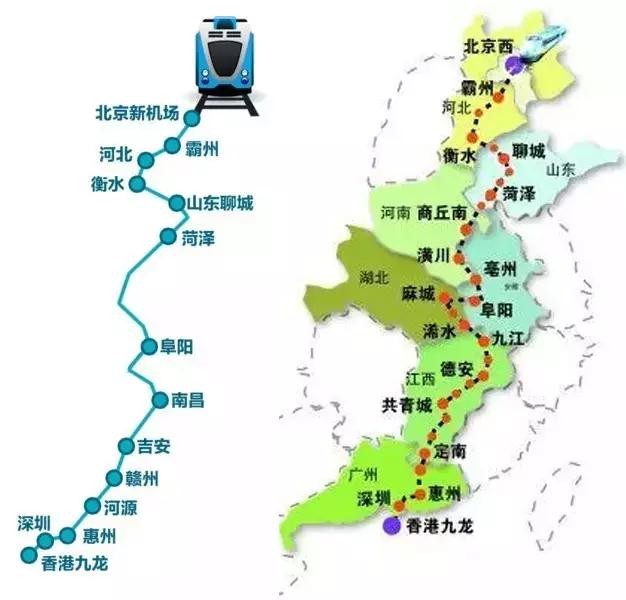京九高铁是从北京引出,经北京新机场、霸州、衡水、聊城;再接商丘-合肥-杭州高铁北段,由聊城继续向南,经菏泽,到达阜阳。接南昌、吉安,赣州再往南到河源、惠州、深圳,再往南最终连接香港。根据上述环评公示,整个京九高铁将采用时速350公里的设计。