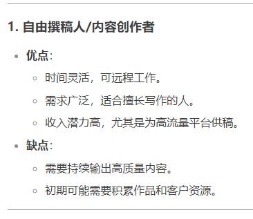 优点:时间灵活,可远程工作。需求广泛,适合擅长写作的人。收入潜力高,尤其是为高流量平台供稿。缺点:需要持续输出高质量内容。初期可能需要积累作品和客户资源。