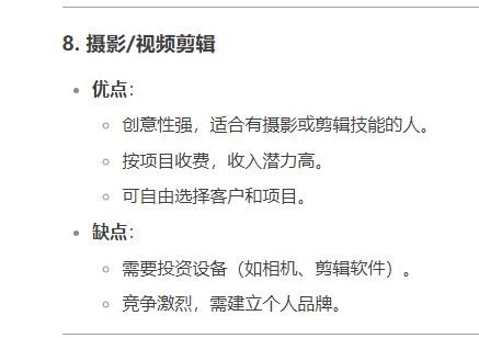 优点:创意性强,适合有摄影或剪辑技能的人。按项目收费,收入潜力高。可自由选择客户和项目。缺点:需要投资设备(如相机、剪辑软件)。竞争激烈,需建立个人品牌。