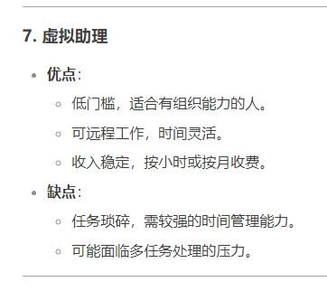 优点:低门槛,适合有组织能力的人。可远程工作,时间灵活。收入稳定,按小时或按月收费。缺点:任务琐碎,需较强的时间管理能力。可能面临多任务处理的压力。