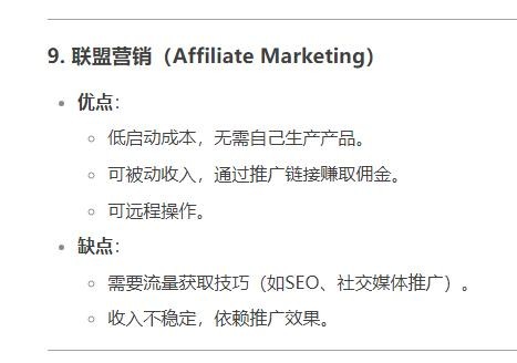 优点:低启动成本,无需自己生产产品。可被动收入,通过推广链接赚取佣金。可远程操作。缺点:需要流量获取技巧(如SEO、社交媒体推广)。收入不稳定,依赖推广效果。