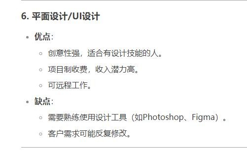 优点:创意性强,适合有设计技能的人。项目制收费,收入潜力高。可远程工作。缺点:需要熟练使用设计工具(如Photoshop、Figma)。客户需求可能反复修改。