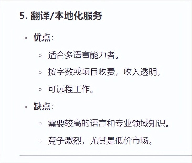 优点:适合多语言能力者。按字数或项目收费,收入透明。可远程工作。缺点:需要较高的语言和专业领域知识。竞争激烈,尤其是低价市场。