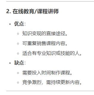 优点:知识变现的直接途径。可重复销售课程内容。适合有专业知识或技能的人。缺点:需要投入时间制作课程。竞争激烈,需持续更新内容。