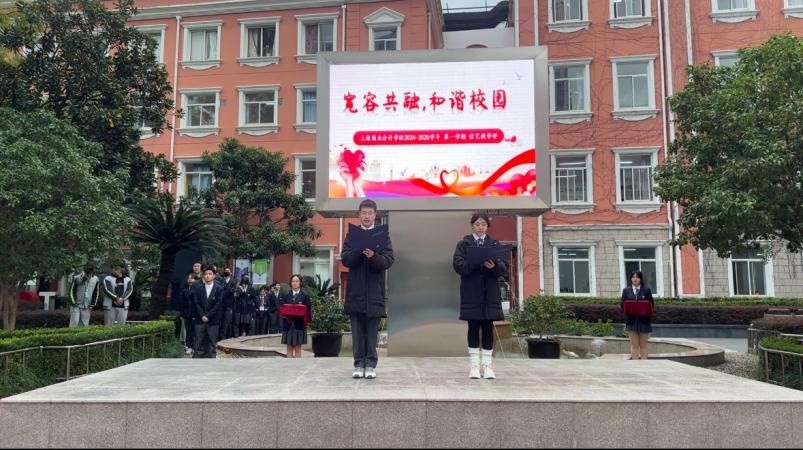 “宽容共融,和谐校园”主题升旗仪式在做好物防、技防等硬件防护的同时,上海商业会计学校也高度重视心理防护建设。为此,学校举办了以“宽容共融,和谐校园”为主题的升旗仪式,并精心设计了多个环节,以学生代表演讲、主题视频播放、情景剧表演等多种形式,深入诠释宽容与谅解的内涵。活动强调了换位思考的重要性,引导学生在面对冲突时学会换位思考,通过理性沟通化解矛盾。