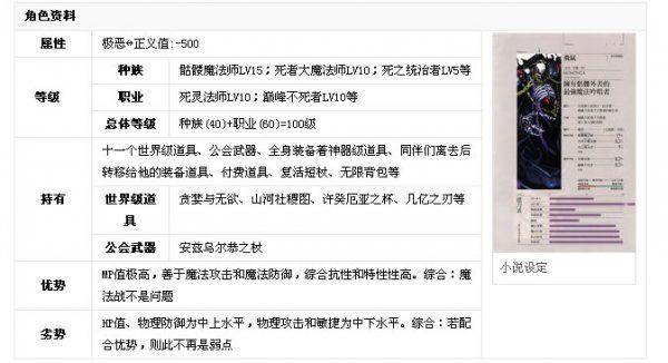 在现实世界是位踏入社会的青年男子,真实姓名叫铃木悟;在公会则是“安兹·乌尔·恭”的会长;在纳萨里克地下大坟墓是至高无上的四十一位至尊的统合者;在异世界是知名度极高的世界级战士,魔导国之“王”。